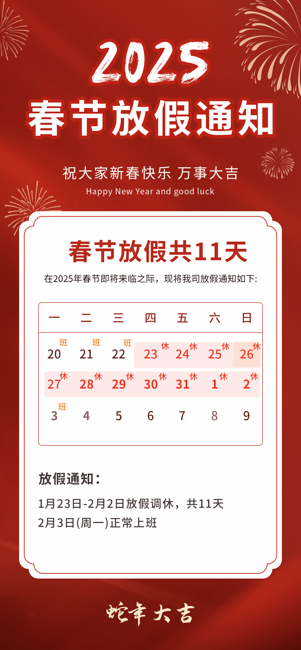 為了讓公司員工過一個歡樂祥和的春節(jié),將對春節(jié)假日提前和延長,現(xiàn)將公司春節(jié)放假時間通知如下:2025年1月23日(農(nóng)歷臘月二十四)~2025年2月2日(農(nóng)歷正月初五)(共計(jì)11天),2月3日(農(nóng)歷正月初六)正式上班。